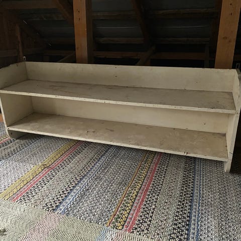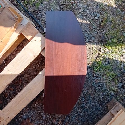 Tumma kaunis pikkuhylly. Pientä ajan patinaa. Oikealta puolelta puuttuu pieni listan pätkä ylhäältä ja alhaalta. Edestä päin katsottuna tähän ei juuri kiinnitä huomiota. Mitat noin mittoja.
