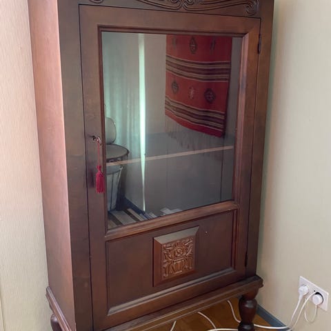 Erittäin kaunis vanha vitriini/kaappi. Yläosassa kolme kaappia ja alaosassa myös kolme kaappia. Ovet voi lukita, avaimet tallessa. Ylä- ja alaosan voi pitää erillään jos haluaa, ovat irralliset osat. Yläosan syvyys on 28 cm ja alaosan 40 cm. Haku keskustasta, talossa on hissi.