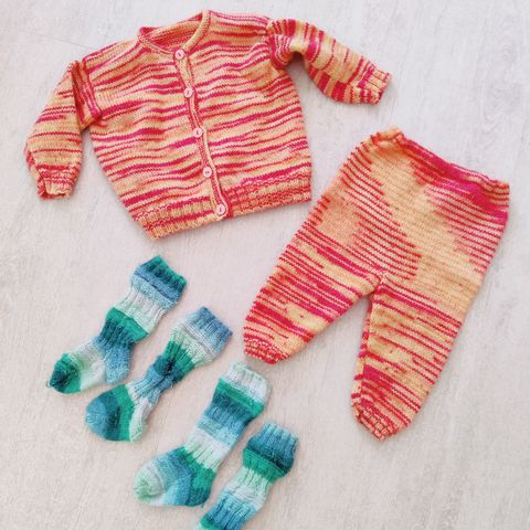 Kerran päällä käyneet paita ja housut. Housuissa kahdessa kohdassa haaleaa värjäymää (kuva), en ole yrittänyt pestä pois.