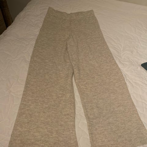 Myydään kuvan harmaat neuloshousut, joissa leveät lahkeet ja korkea kuminauhavyötärö.