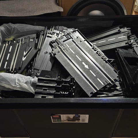 Sähköinen autorata, varastossa lepäillyt lähes 20-vuotta, nyt koottu ja juuri testattu molemmat autot ja ohjaimet muutamalla kierroksella ajamalla, TOIMII 🙂! Ohjelappunenkin mukana, niin helppo kasata uudelleen. Ei laatikkoa tallessa.