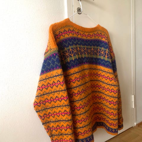 Suomessa valmistettu käsin villapaita. Tiedon mukaan valmistettu 7 veljestä langasta. Koko M/L