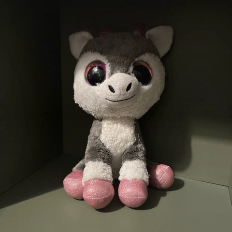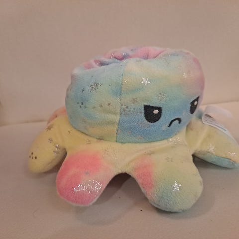 Pehmolelu, joka esittää vihreää kaktusta oranssassa ja ruskeassa ruukussa. Kaktuksella on violetti hattu ja harmaa-valkoinen huivi. Pehmolelu on pehmeä ja sopii lasten leikkeihin tai koristeeksi.