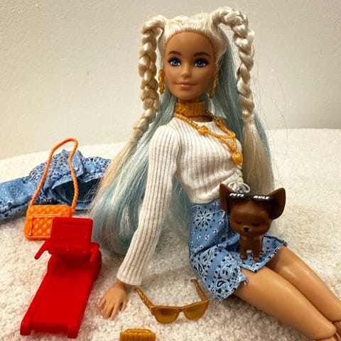 Barbie Extra nukke ja pupu. Mukana vaatteita, kenkiä, asusteita, koruja ja pupu.