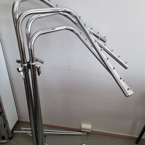 Puinen vaateteline, jossa on useita tankoja vaatteiden ripustamiseen. Sopii vaatteiden järjestämiseen ja säilytykseen.