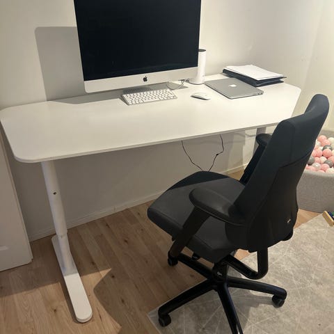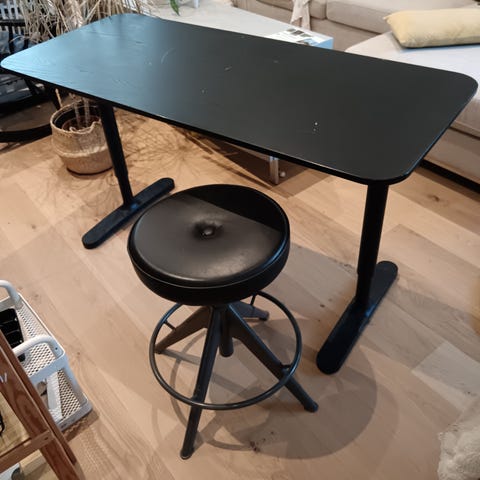 IKEA työpöytä Alex ja tuoli musta. Työpöytä on musta, jossa on kaksi vetolaatikkoa. Tuoli on musta istuinosaltaan ja selkänojaltaan, valkoisella jalustalla. Sopii työskentelyyn tai opiskeluun.