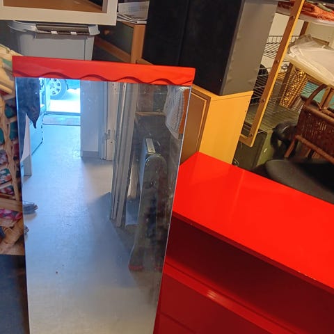Peilin leveys 77 ja korkeus 57 cm. Peilit ehjät ja hyväkuntoiset. Peiliosa irroitettava. Laatikot sisältä puupinnalla, sisällä enemmän jälkiä.