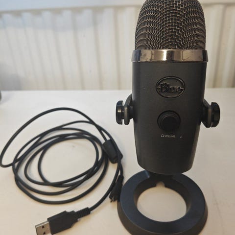 Logitech mikrofoni mustalla värillä ja kiinteällä jalustalla. Sopii erilaisiin äänitystarpeisiin kuten podcastaukseen, striimaukseen ja videopuheluihin.