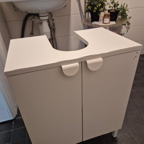 Valkoinen allaskaappi, jossa on kaksi ovea ja sisähylly. Kaapissa on aukko putkille yläosassa.