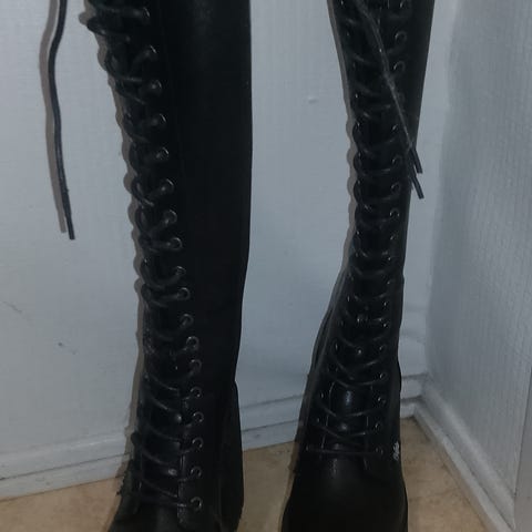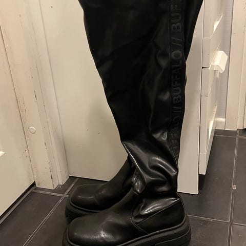 Pitkävartiset käytetyt Buffalo nahkasaappat vielä hyvässa kunnossa. Koko 39 (26cm). Kenkän ympärys 18 cm. Varren pituus 40 cm. Sisävuori nahka.