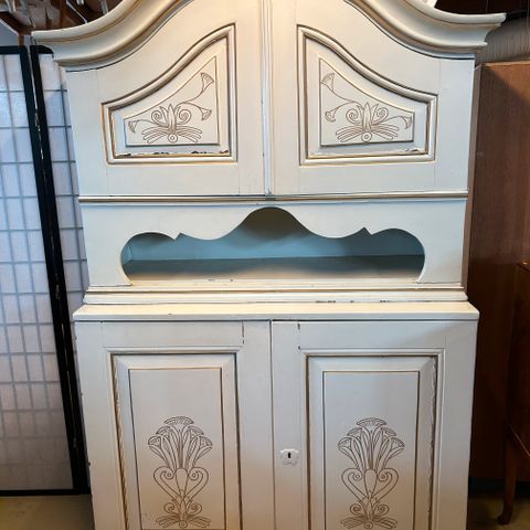 Värikäs talonpoikaistyyliä edustava astiakaappi, jossa on koristeelliset kukkamaalaukset ovissa. Kaapissa on kaksi ylä- ja alakaappia, jotka tarjoavat runsaasti säilytystilaa. Kaapin yläosa on kaareva ja korostaa sen perinteistä muotoilua.Talonpoikaistyyli on tunnettu yksinkertaisuudestaan ja käytännöllisyydestään, ja se on ollut suosittu maaseudun kodeissa. Tämä kaappi edustaa juuri tätä tyyliä, yhdistäen käytännöllisyyden ja koristeellisuuden.Kaapissa on näkyviä kulumia ja maalipinnan kulumista. Kaappi on 1800-luvulta.Menee kahteen osaan.