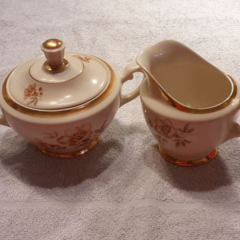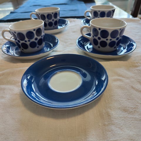 Kaksi kuppia ja lautaset ovat hyvässä kunnossa, niissä hieman pintakulumaa, mutta yhdessä lautasessa ja kupissa on pieni särö. Paketissa siis 2 ehjää settiä ja 1 kpl setti, jossa vekki.