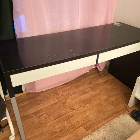 Työpöytä koululaiselle. Pöytälevyssä pieniä käytön jälkiä.