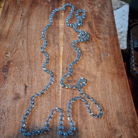 Tummanharmaa kristallikaulakoru. Pituus noin 150cm. Tosi kimaltelevat.