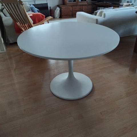 Myydään hyväkuntoinen, jämäkkä ruokapöytä, halkaisija 110cm. Pinta kunnossa.