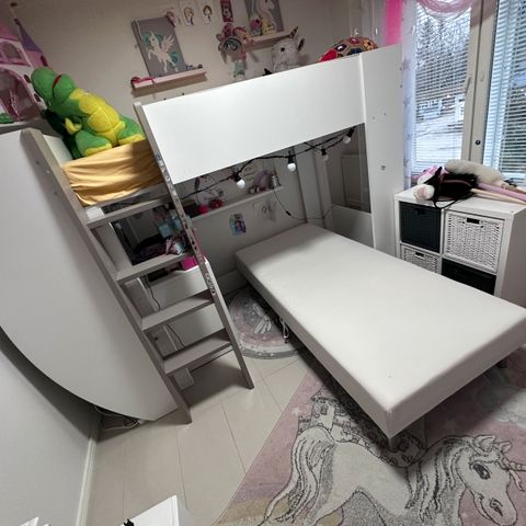 Myydään laadukas ja jämäkkä kerrossänky, jossa alatasolla mukava vuodesohva. Erinomainen valinta lastenhuoneeseen, vierashuoneeseen tai pieneen asuntoon, jossa tila halutaan hyödyntää tehokkaasti.