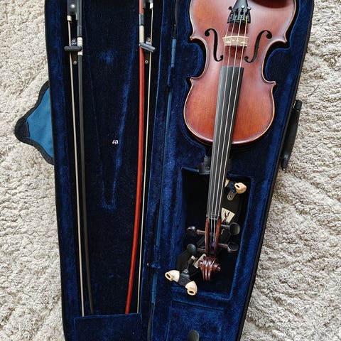 Yamaha V-5 3/4 kokoinen viulu, valmistettu Kiinassa vuonna 2012. Mukana viulun jousi ja olkatuki sekä hartsi ja yksi kielisarja. Laadukas ja hyvin soiva viulu aloittelijalle tai hetken aikaa soittaneelle nuorelle. Erittäin siisti.