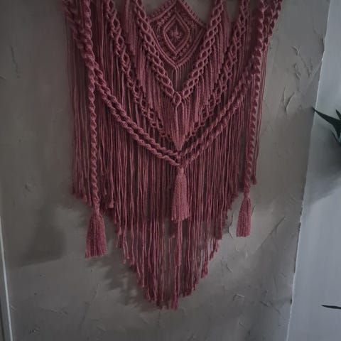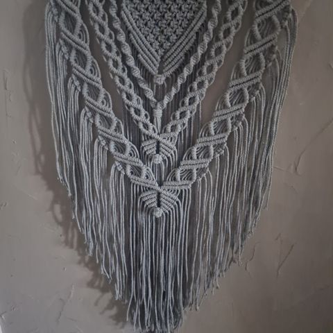 Chunkymop vihreä/luonnonvalkoinen langasta tehty makramee. L63xP97cm + ripustusnaru. Kepin pituus: 71cm. Hinta: 60e+pk