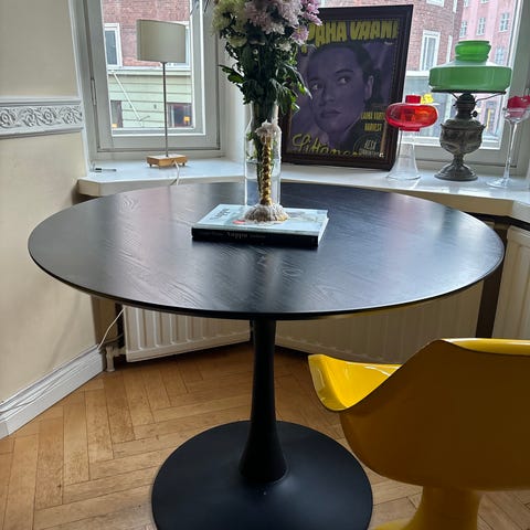Pyöreä halkaisijaltaan 100cm ruokapöytä. Jonkinverran naarmuja pinnassa.