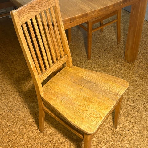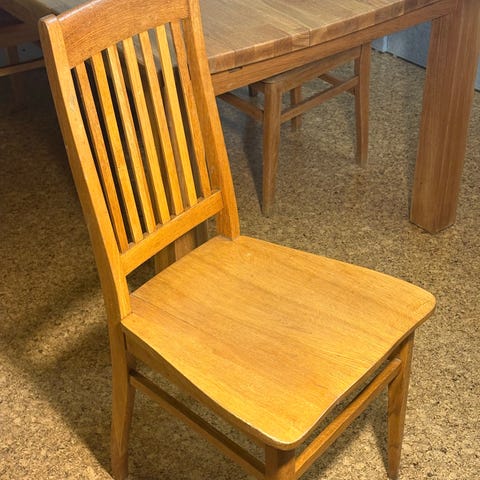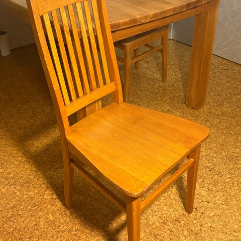 Billnäs-tyylinen vanha ruokapöydän tuoli. Ilmeisesti tammipuuta. Tukeva istua. Saattaa olla myös alkuperäinen Billnäs, mutta ilman leimoja.