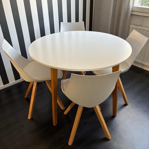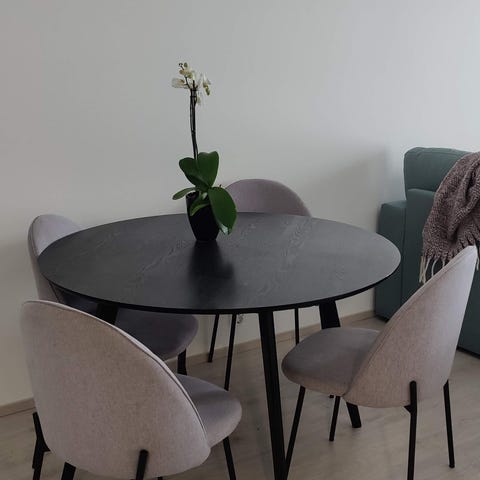 Musta pyöreä ruokapöytä ja neljä tuolia. Hyvässä kunnossa, pöydässä muutama jälki niistä kuvat.