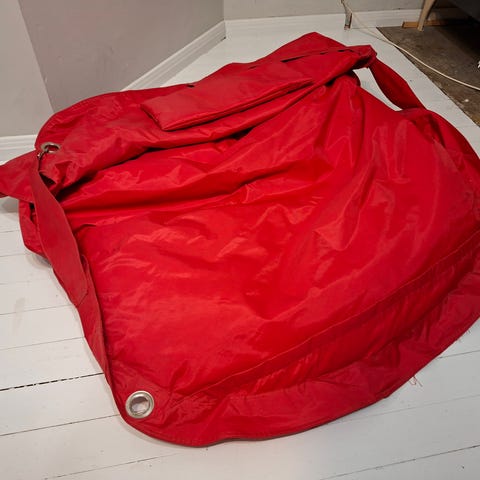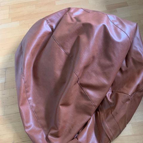 Hyväkuntoinen ruskea nahkainen säkkituoli. Koko lätässä 105x90.
