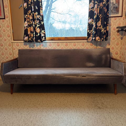 Hyväkuntoinen kasarisohva, josta saa 120 cm leveän vuoteen. Sohvan sisällä hetekamainen taittuva laveri ja superlonpatja.