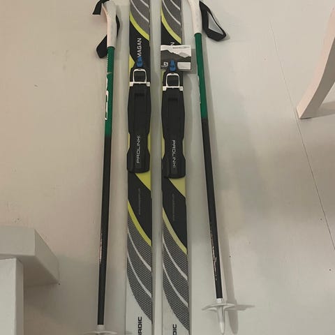 Myydään Salomon sukset ja Nova sauvat. Suksien pituus 121cm, sauvat 85cm. Sns-siteet.