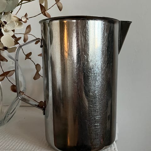 Harmaa 0,5 litraa, korkeus n.13 cm, suuaukon halkaisija n.8 cm.