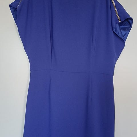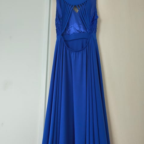 Myydään uusi sininen juhlamekko kokoa 38/M. Hihat on 3/4 ja olka-helma mitta 95cm.