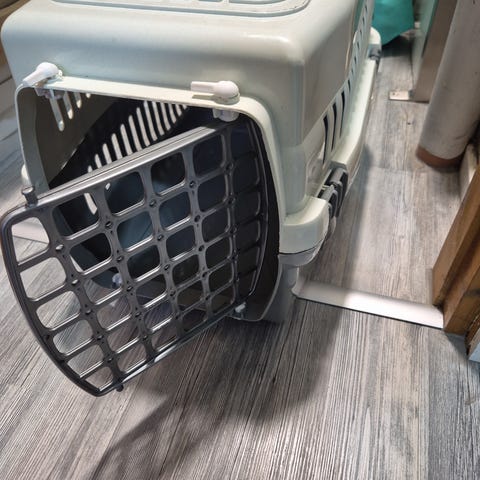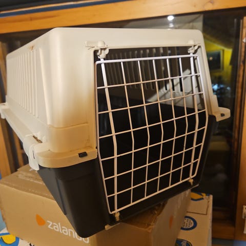 Matkakuljetuskoppa pienille eläimille, väriltään valkoinen ja sinisin yksityiskohdin. Kopassa on kantokahva kannessa ja metallinen etuovi, joka avautuu eteenpäin. Sivut ja takaosa ovat ilmastoidut ritilöillä. Sopii eläinten turvalliseen kuljetukseen.