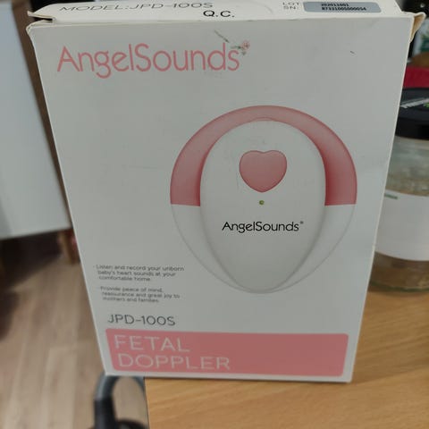 Kotidopplerlaite sikiön sydänäänten kuunteluun. Mukaan saa melkein täyden ultraäänigeelipurkin (parasta ennen 7/26) ja vaihtopariston. Laitetta käytetty n. 10-20 krt, alkuraskaudesta tykkäsin kuunnella kun ei vielä potkuttelut tuntuneet. Takakansi teipattu, muuten kunnossa ei moitteita.