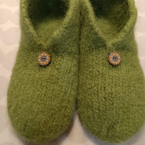 Itse huovutetut tossut koko 39-42 ruskea väri. Lankana laadukas Alafosslopi 100% Islannin villalanka. Todella lämpimät ja mukavan kevyet jalassa. Uudet. Saa myös ilman koristesydämiä