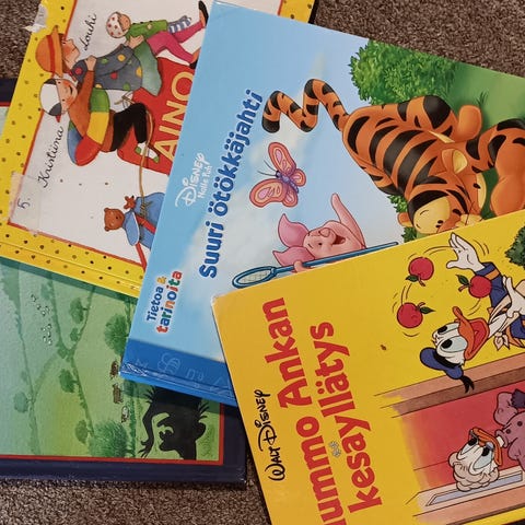 Annetaan kuvan 3 minikokoista lastenkirjaa. Kirjat paljon luettuja, mutta ehjiä.