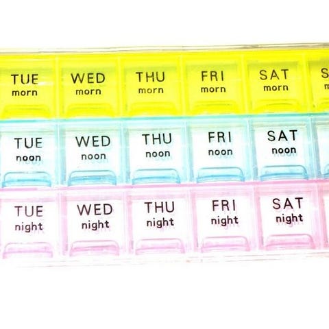 Värikäs viikkoannostelija, jossa on seitsemän lokeroa eri viikonpäiville. Soveltuu lääkkeiden tai vitamiinien annosteluun viikoittain.