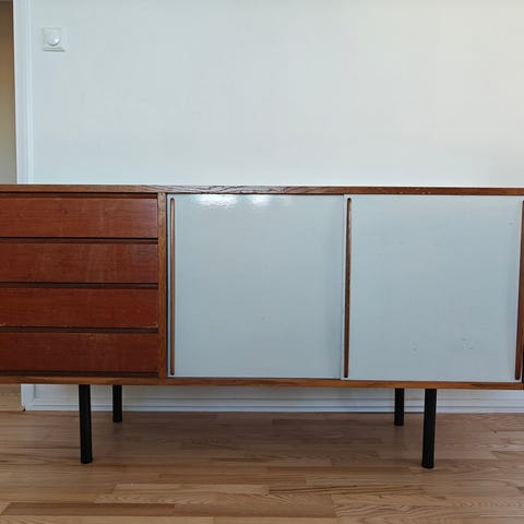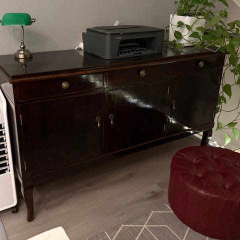 Vanha vintage-tyylinen harmaaksi maalattu puinen senkki. Yleisilme on tosi siisti, mutta pinnassa on käytön jälkiä (ks. Kuvat), ja maali joistakin kohdista hieman lohjennut. Sisäpuolella aiempi vihreä maali, hylly ja vetolaatikoiden sisukset maalaamattomat ja siistit.