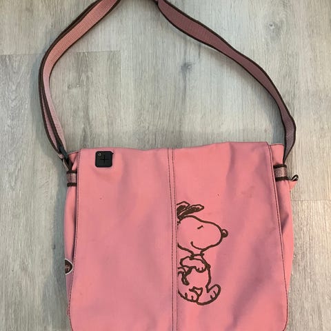 Hyväkuntoinen tilava Snoopy aiheinen olkalaukku. Konepestävä.