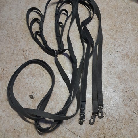 Treeniohjat säädettävillä monilenkeillä. Alkuosa nahkaa, loppuosa kangasta. Alkuperäiset lukot.