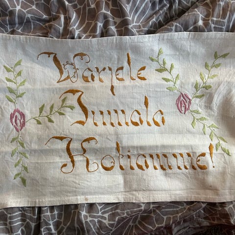 Kangaspuilla kudottu pellavaliina hillityin värein,aivan uusi.