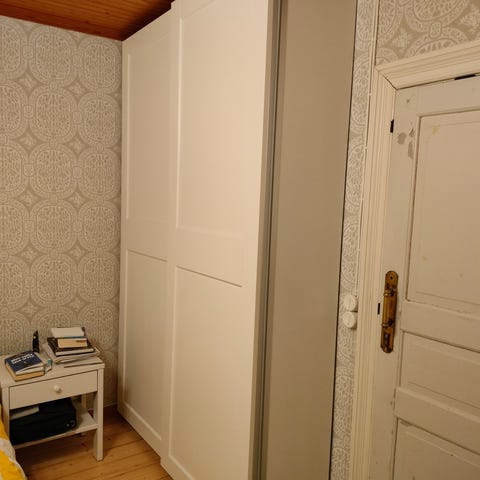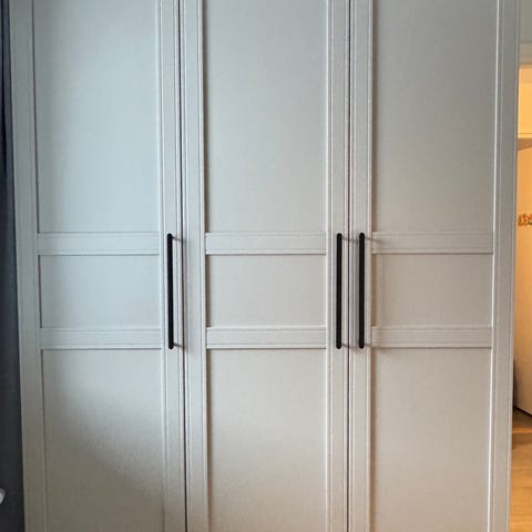 Kolme valkoista Ikean Pax vaatekaappia sisuksineen.