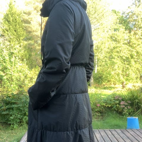 Ritva Fallan Marimekolle suunnittelema, kauniin A-linjainen laadukas, ajaton takki. Erittäin hyvässä kunnossa. Olka-helma n.92cm. Ei kovien pakkasten takki, mutta kokonaan vuoritettu.