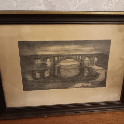 Teoksessa kuvattu vanha pihapiiri. Teksteistä vaikea saada selvää. Kehystetty laadukkaasti. Koko 33 x 25 cm.
