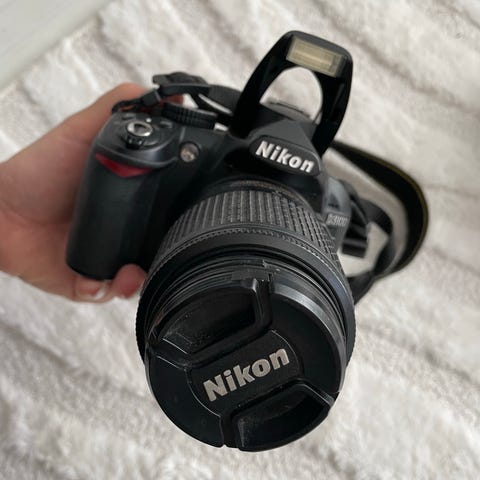 Nikon D3100 järjestelmäkamera, jossa on AF-S Nikkor 18-55mm f/3.5-5.6G VR objektiivi. Valmiina käyttöön.