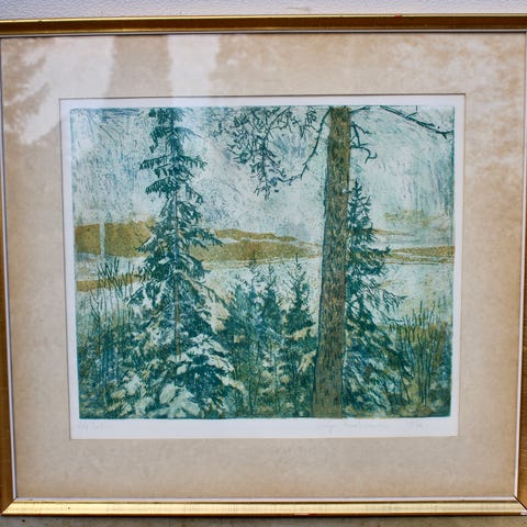 Kehystetty maisemamaalaus, jossa näkyy järvimaisema ja puita. Maalaus on toteutettu pehmeillä ja hillityillä väreillä, ja se on kehystetty vaalean sävyisellä kehyksellä. Koko 84 cm x 75,5 cm.