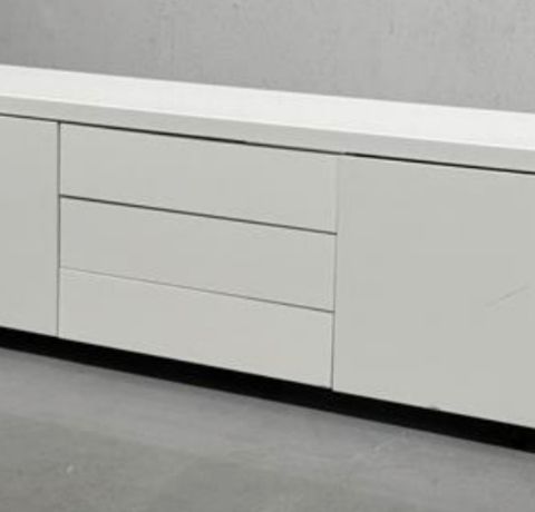 Avattavat ovet molemmilla reunoilla, keskellä avohylly. Tammiviilu päällyslevy. Myydään ilman jalkoja.