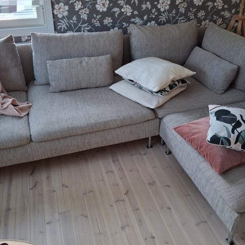 Myynnissä erittäin suuren suosion saavuttanut Iken Söderhamn sarjan kulmasohva käsinojilla. Ryhmä koostuu: 2 x 1:n istuttava osa, kulmapala ja 2 x käsinoja. Kyseisen kokoista sarjaa harvoin tarjolla ainakaan käsinojilla. Kompaktin kokonsa ansiosta tämä ryhmä soveltuu hyvin erillaisiin tiloihin. Kaikkien osien rungot ovat ehjät. Päällisten väri: Samsta tummanharmaa. Kyseinen kangas on hyvin sileäpintainen ja hieman eläväinen. Tästä johtuen kuvaaminen mahdotonta. Ryhmän kaikki päälliset ovat irroitettavissa pesuun. Runkojen päälliset mukaan lukien. Lisäksi päälliset ovat halutessaan vaihdettavissa. Huomioitavaa ryhmän kunnossa: Kaksi minimaalisen pientä tahraa löysin pesusta huolimatta istuintyynyjen päällisistä. Tämä huomioitu hinnassa. Ryhmän hinta: 699€. ALENNETTU HINTA: 629€