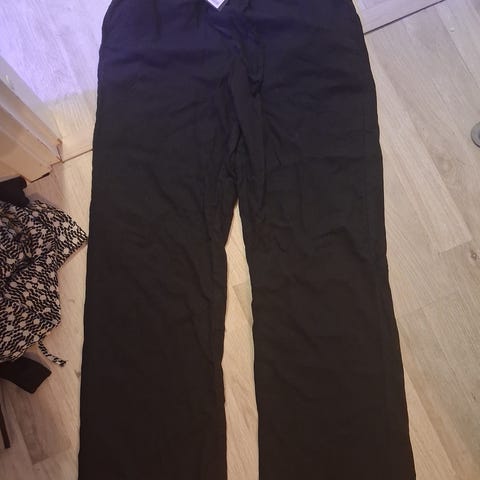 Mustat pehmeät housut kivoilla yksityiskohdilla, sivulla punainen raita ja vyötäröllä kiva naru