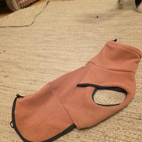 Fleecetakki selkämitta 70cm. Yksinkertainen tekele mutta ajaa varmasti asiansa. Ehjä. Tarrakiinnitys