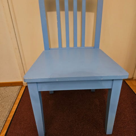 Vihreä tuoli lapselle. Enää meillä ei ole sen ikäistä istujaa. On vähän pintavikaa. Selkänojassa hiukan klappia. Tuoli on kyllä kestänyt aikuisenkin istua. Korjaustaitoinen saisi tästä erinomaisen pikkuväen istuimen, mutta näinkin saattaa toimia hyvin leikeissä.