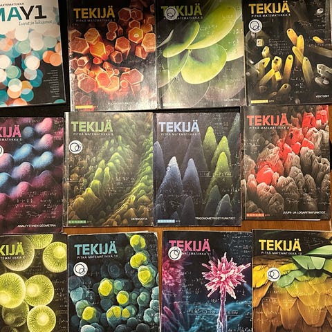 Koko setti kympillä, muissa ei ooe merkintöjä paitsi biologian kirjassa alleviivauksia teksteissä.